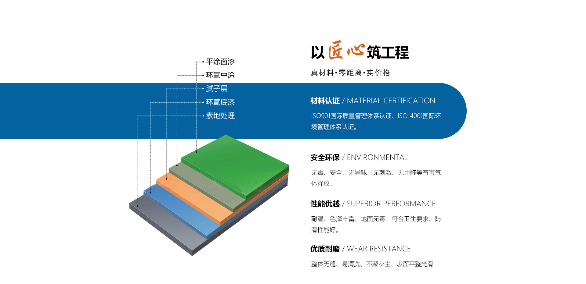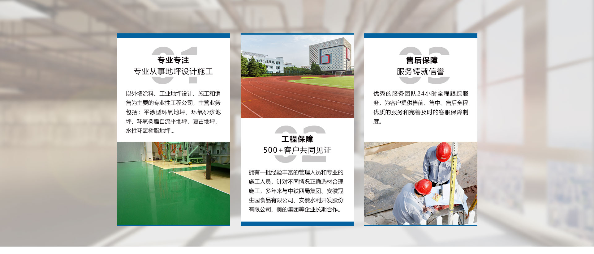安徽世博裝飾工程有限公司成立于2009年,是一家以外墻涂料、工業(yè)地坪設(shè)計(jì)、施工和銷售為主要的專業(yè)性工程公司、是工業(yè)地坪施工的專業(yè)企業(yè)。公司設(shè)立了售后服務(wù)中心,用戶遍布全國大中小城市,一大批具有標(biāo)志性的長期合作伙伴。“世博公司”環(huán)氧地坪工程,受到了越來越多的不同行業(yè)用戶的好評及青睞。公司擁有一批經(jīng)驗(yàn)豐富的管理人員和專業(yè)的施工人員,以保障產(chǎn)品的成功應(yīng)用,用較小的代價(jià)獲得理想的效果,尤其在地坪涂裝方面優(yōu)勢突出。而且以好的品質(zhì)管理模式,向客戶提供“獨(dú)具魅力”、“性能優(yōu)異”、“質(zhì)量穩(wěn)定”的產(chǎn)品。公司主要產(chǎn)品包括:平涂型環(huán)氧地坪、環(huán)氧砂漿地坪、環(huán)氧樹脂自流平地坪、滾涂型防靜電地坪、自流平防靜電地坪、復(fù)古地坪、水性環(huán)氧樹脂地坪、彩色透水混凝土地坪、壓花壓模藝術(shù)地坪、金剛砂耐磨硬化地坪、混凝土密封固化劑地坪、乙烯基酯重防腐地坪、GEP 標(biāo)準(zhǔn)型地坪、彈性PU運(yùn)動(dòng)場地坪、塑膠跑道地坪,PVC橡膠地板、停車場地坪、無震...